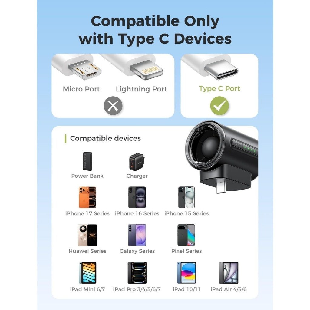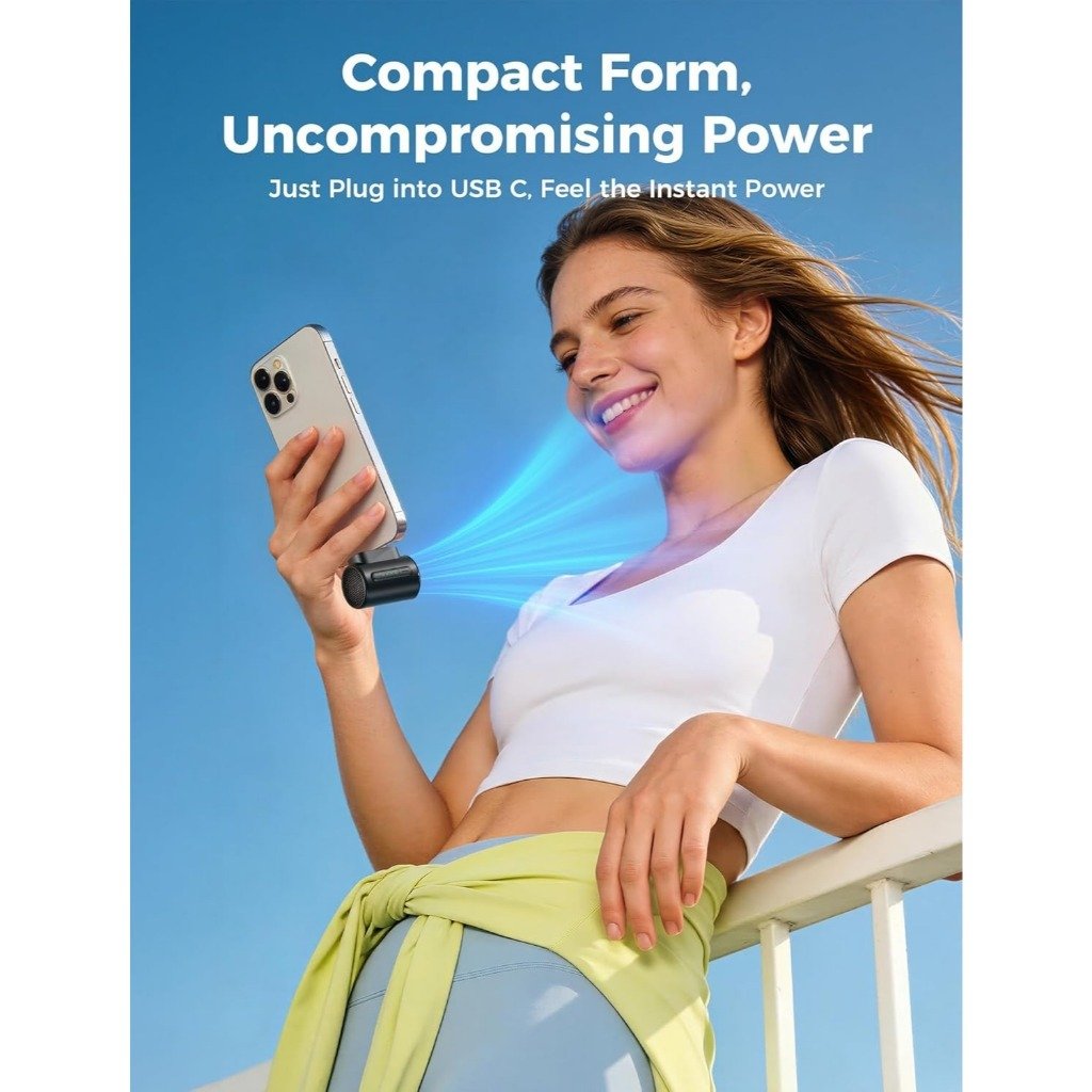 Điểm đặc biệt nhất của AECOOLY Air Mate là thiết kế không tích hợp pin. Quạt hoạt động bằng cách cắm trực tiếp vào cổng USB Type-C của các thiết bị cấp nguồn như: Điện thoại thông minh (tương thích hoàn hảo với iPhone 15/16 series, các dòng máy Android), iPad, máy tính bảng hay sạc dự phòng. Thiết kế này không chỉ giúp quạt giảm tối đa trọng lượng mà còn loại bỏ hoàn toàn nỗi lo chai pin, hỏng pin hay quên sạc điện cho quạt. Cứ cắm là mát!